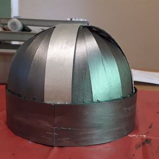 Paint the helmet rim and the strips filling in the gaps on the helmet in dark silver paint. Make sure to push your brush in between the overlapped strips so that there are no white patches.